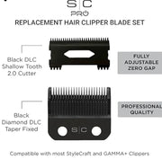 Upgrade your grooming toolkit with the StyleCraft SC539B Replacement Blade Set, which is meticulously engineered to deliver unparalleled cutting precision and longevity. This premium set includes a Fixed Black Diamond Carbon DLC Taper Blade and a DLC Shallow Tooth 2.0 Cutter, designed to enhance your clipper's efficiency and ensure a smoother cutting experience.