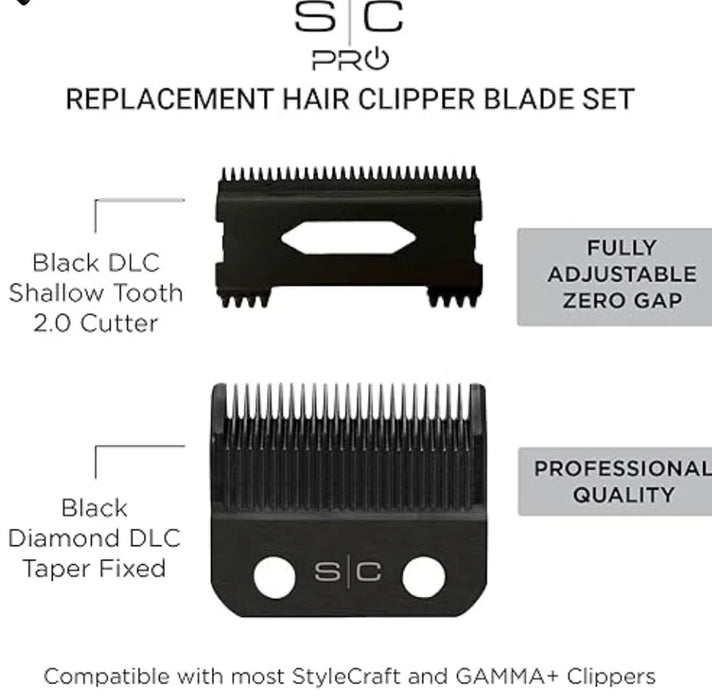 Upgrade your grooming toolkit with the StyleCraft SC539B Replacement Blade Set, which is meticulously engineered to deliver unparalleled cutting precision and longevity. This premium set includes a Fixed Black Diamond Carbon DLC Taper Blade and a DLC Shallow Tooth 2.0 Cutter, designed to enhance your clipper's efficiency and ensure a smoother cutting experience.